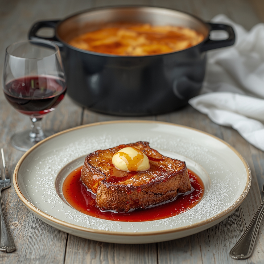 Crème Brûlée French Toast is a variation of classic French toast where the bread is soaked in a custard base and then caramelized with sugar, mimicking the flavors and textures of a crème brûlée dessert. This results in a crispy, sweet topping and a soft, custardy interior.